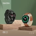 ساعت هوشمند هاینو تکو مدل RW11ساعت هوشمند RW-11 توسط شرکت هاینو تکو آلمان طراحی شده است. دو عدد بند سیلیکونی و طرح چرم به همراه ساعت قرار داده شده است که متناسب با سلیقه و موقعیت می توانید به راحتی بندها را تعویض نمایید. شارژر ساعت از نوع پین مگنت است. ظرافت بالا و زیبایی ظاهری کاملا در طراحی رعایت شده است. سنسور چرخش دست این ساعت دارای دقت بالایی است که برای چک کردن زمان دیگر نیازی به فشردن دکمه وجود نخواهد داشت. کیفیت سنسورهای سلامتی این ساعت هوشمند نسبت به تمام ساعت ها در این رنج قیمتی بالاتر است. این اسمارت واچ دارای منوی فارسی و فونت زیبای فارسی برای نمایش پیام ها است که نگرانی در خصوص نمایش شکسته حروف و عدم پشتیبانی از پیام های فارسی وجود نخواهد داشت. میکروفون و اسپیکر به کار گرفته شده در این ساعت دارای کیفیت بسیار بالایی هستند که پخش موزیک و مکالمه را با کیفیت بسیار بالا ممکن می سازد.